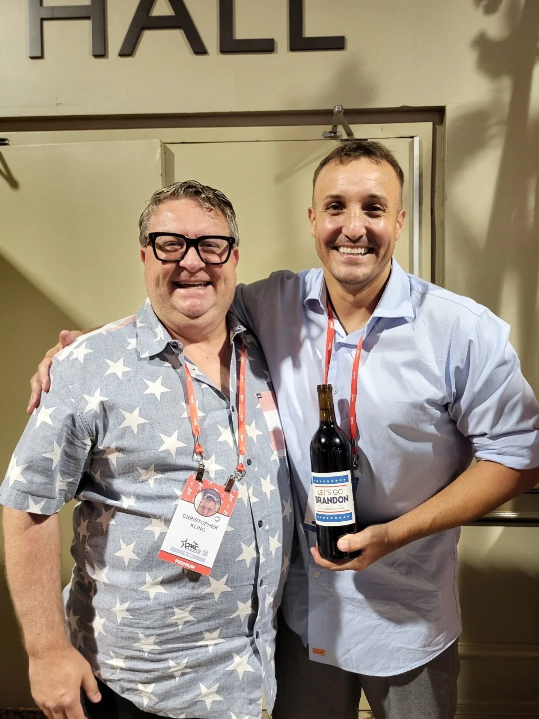 Chris with Lt. Col Stu Scheller, and a bottle of Let’s Go Brandon Wine. (Wrongly court martialed for questioning the disastrous Afghanistan military withdrawal.)